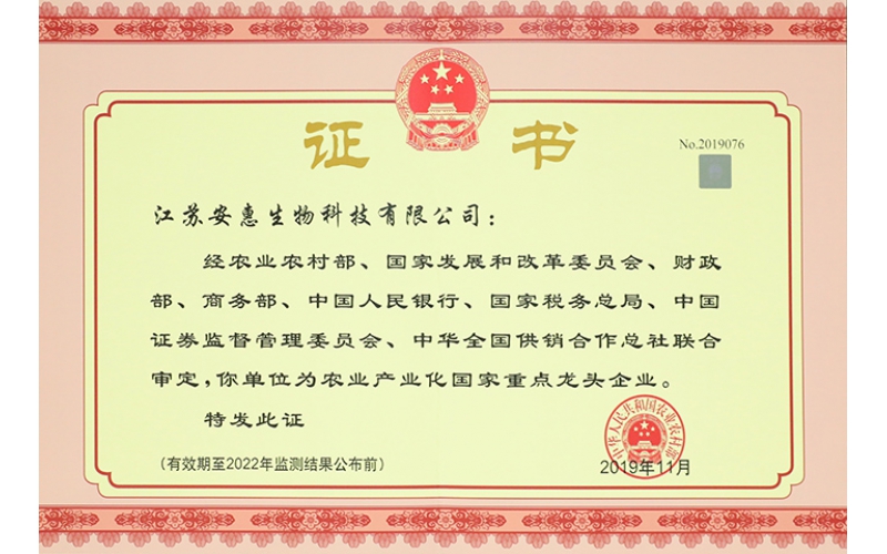 2019年12月,經(jīng)各省(區(qū)、市)遴選推薦、嚴(yán)格把關(guān),專家評(píng)審和全國農(nóng)業(yè)產(chǎn)業(yè)化聯(lián)席會(huì)議審定,農(nóng)業(yè)農(nóng)村部公布了第六批300家農(nóng)業(yè)產(chǎn)業(yè)化國家重點(diǎn)龍頭企業(yè)名單,江蘇安惠生物科技有限公司榜上有名。